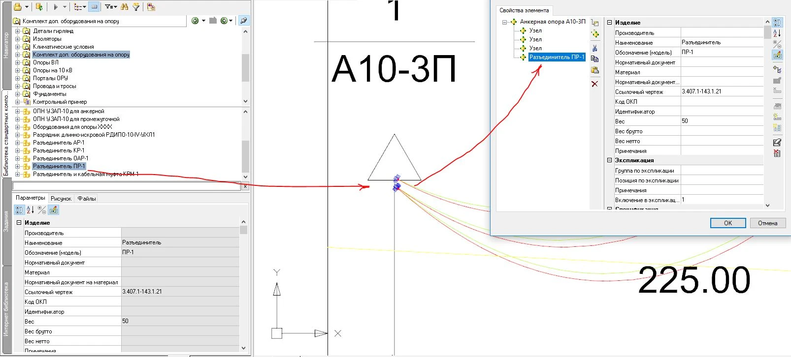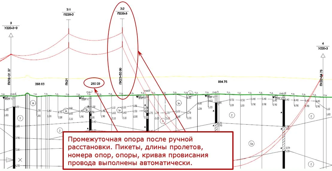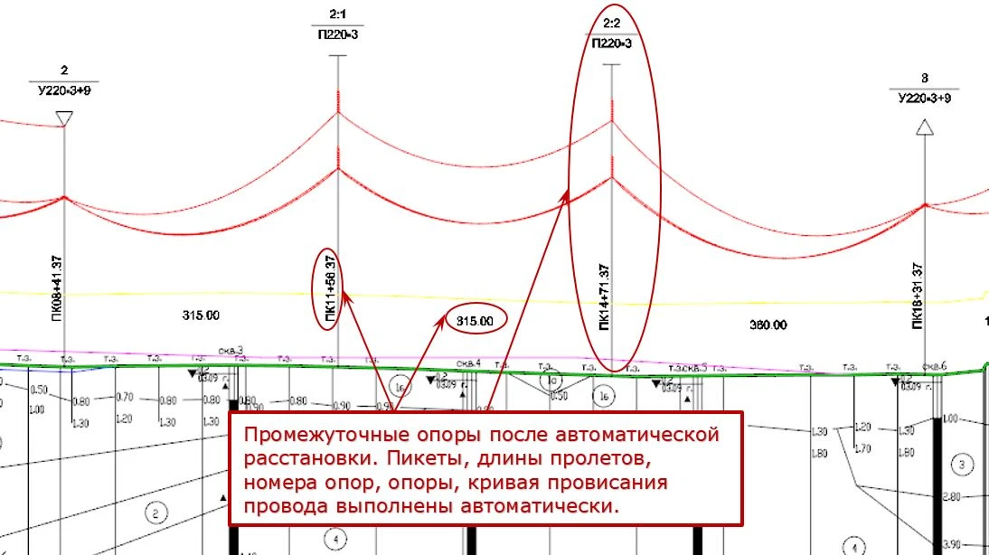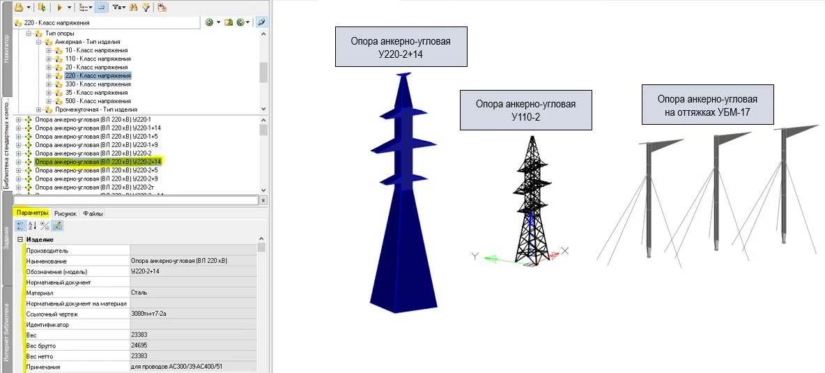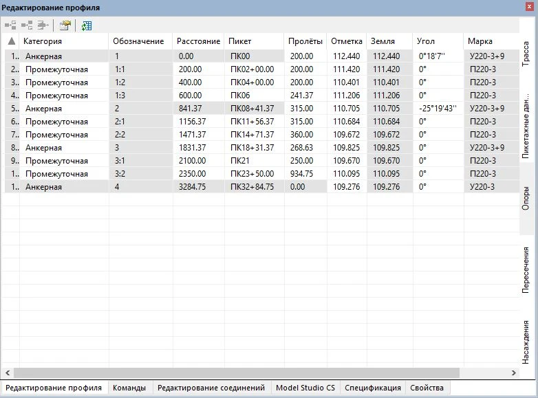 - Изменение положения анкерно-угловых и промежуточных опор на плане/профиле приводит к их смещению в 3D-модели и наоборот;