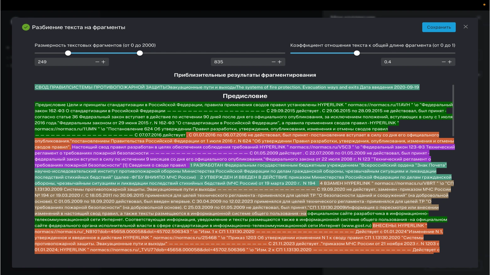 Загруженные документы преобразуются в векторную базу фрагментов, которая будет использована при анализе ИИ. Можно использовать собственные сценарии анализа, вплоть до выявления противоречий
